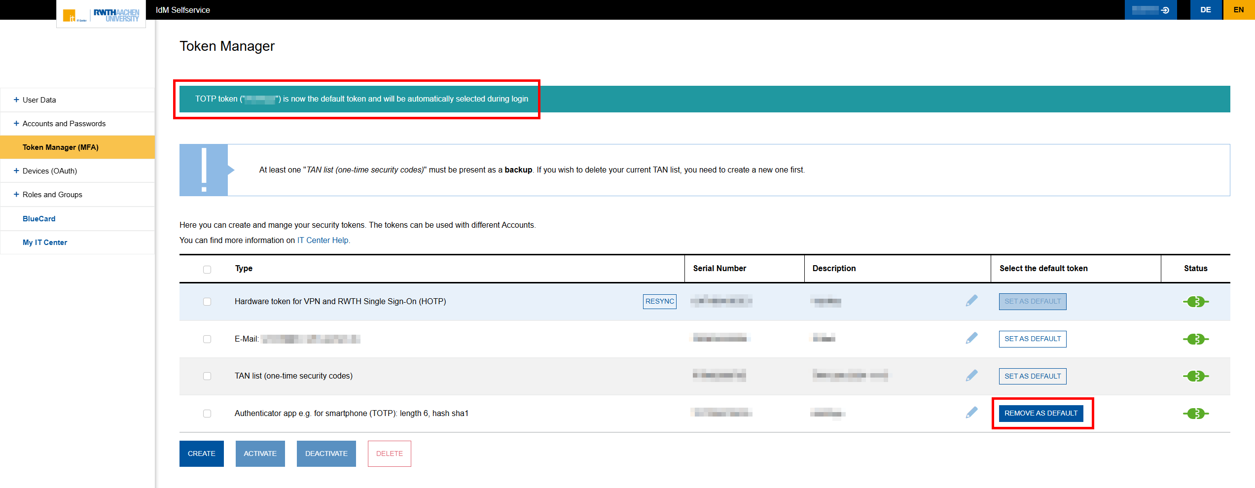 In the “Select as default token” column, click the Set as default button to set the respective token as the default.