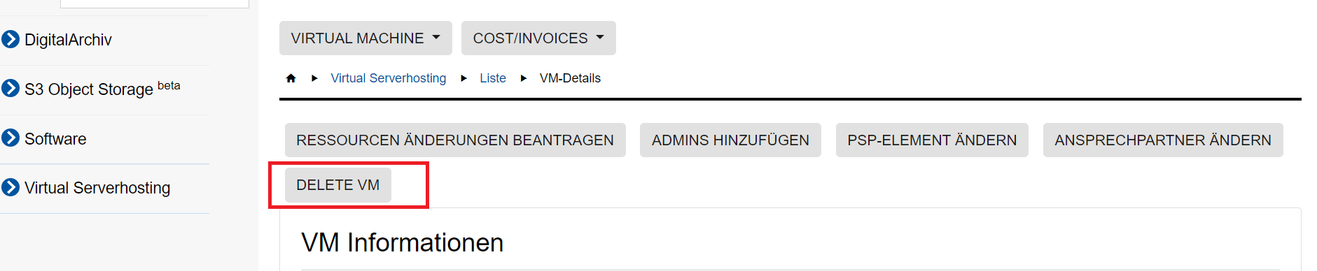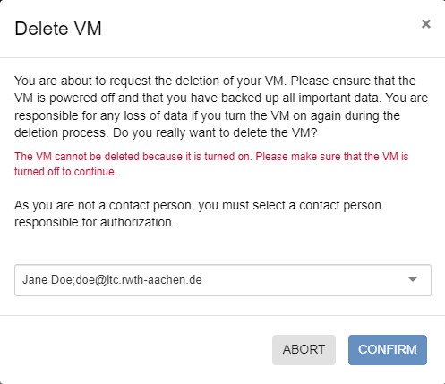 If you are a contact person for the VM, your request is already authorized after clicking on "Confirm" and the VM will be dismantled within a short time.