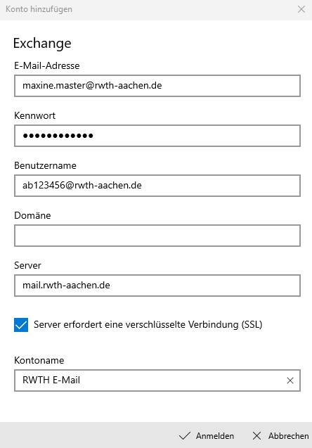 - Username of your RWTH-E-Mail Account (e.g.: ab123456@rwth-aachen.de oder ab123456@sampleinstitute.rwth-aachen.de)