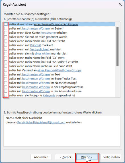 To do this, place a tick in front of the respective exception or exceptions that are to be active. Then click on Next.