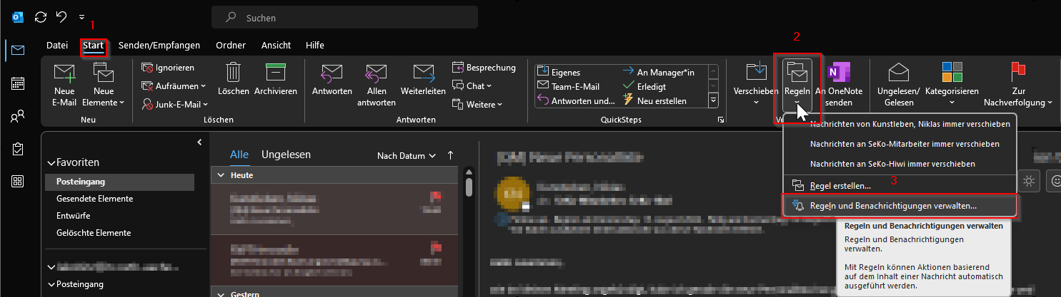 If you are not already there, click on Start (1) in the Outlook mailbox, select Rules (2) in the middle of the top navigation bar and then Manage rules and notifications... (3).