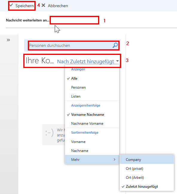 You can either enter an e-mail address yourself (1), search for people from your contacts (2) or go through the structure of your address books yourself and select a contact (3).