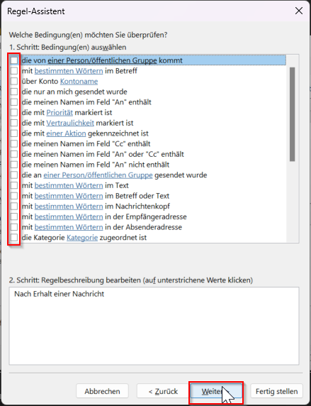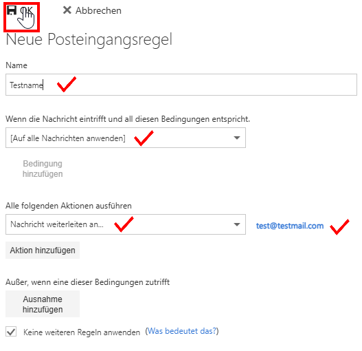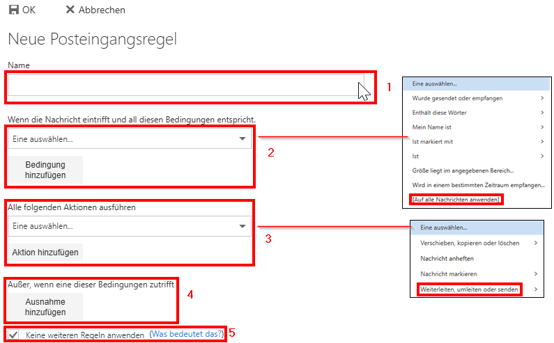 Do not select any settings here (or create an exception option if you want to exclude certain messages).If desired, you can select that other and existing rules are overwritten by this rule (5)