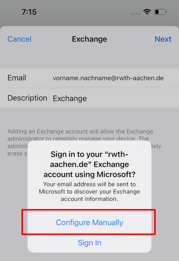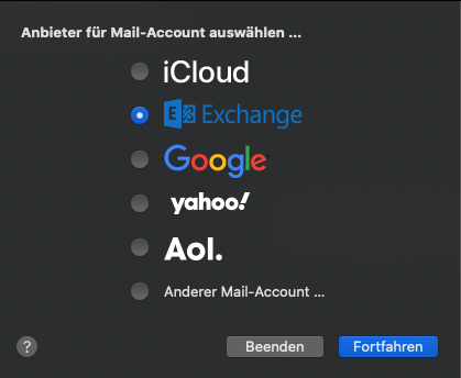 Then select Exchange (Microsoft Exchange may be offered instead of just Exchange. If so, please select this provider).