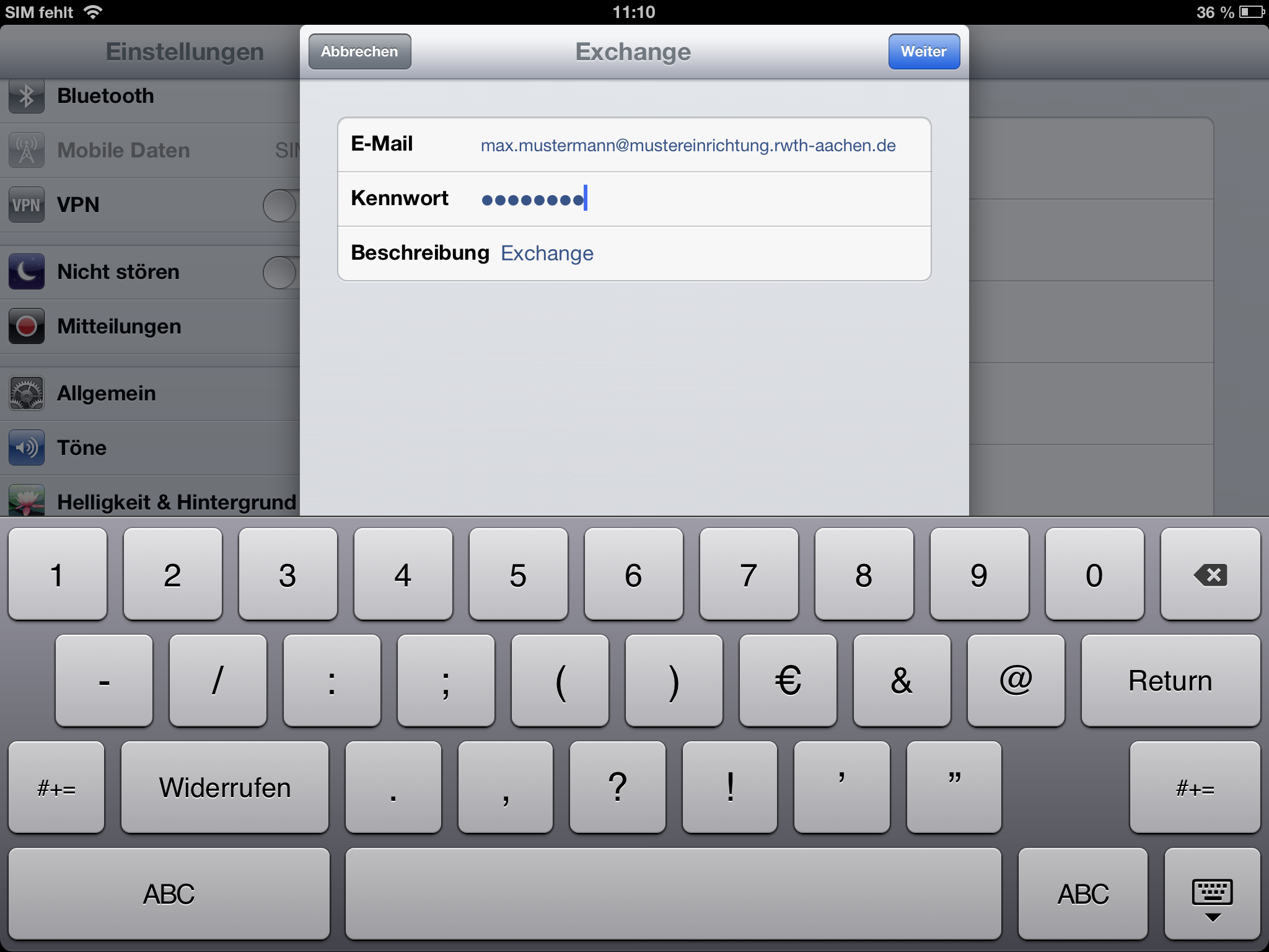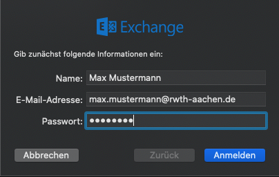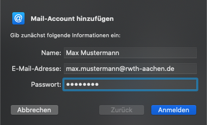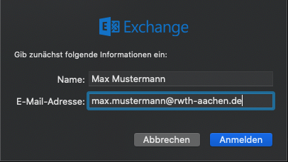 Enter the e-mail address (in the format firstname.lastname@rwth-aachen.de or name@institution.rwth-aachen.de), name and password for the RWTH e-mail account