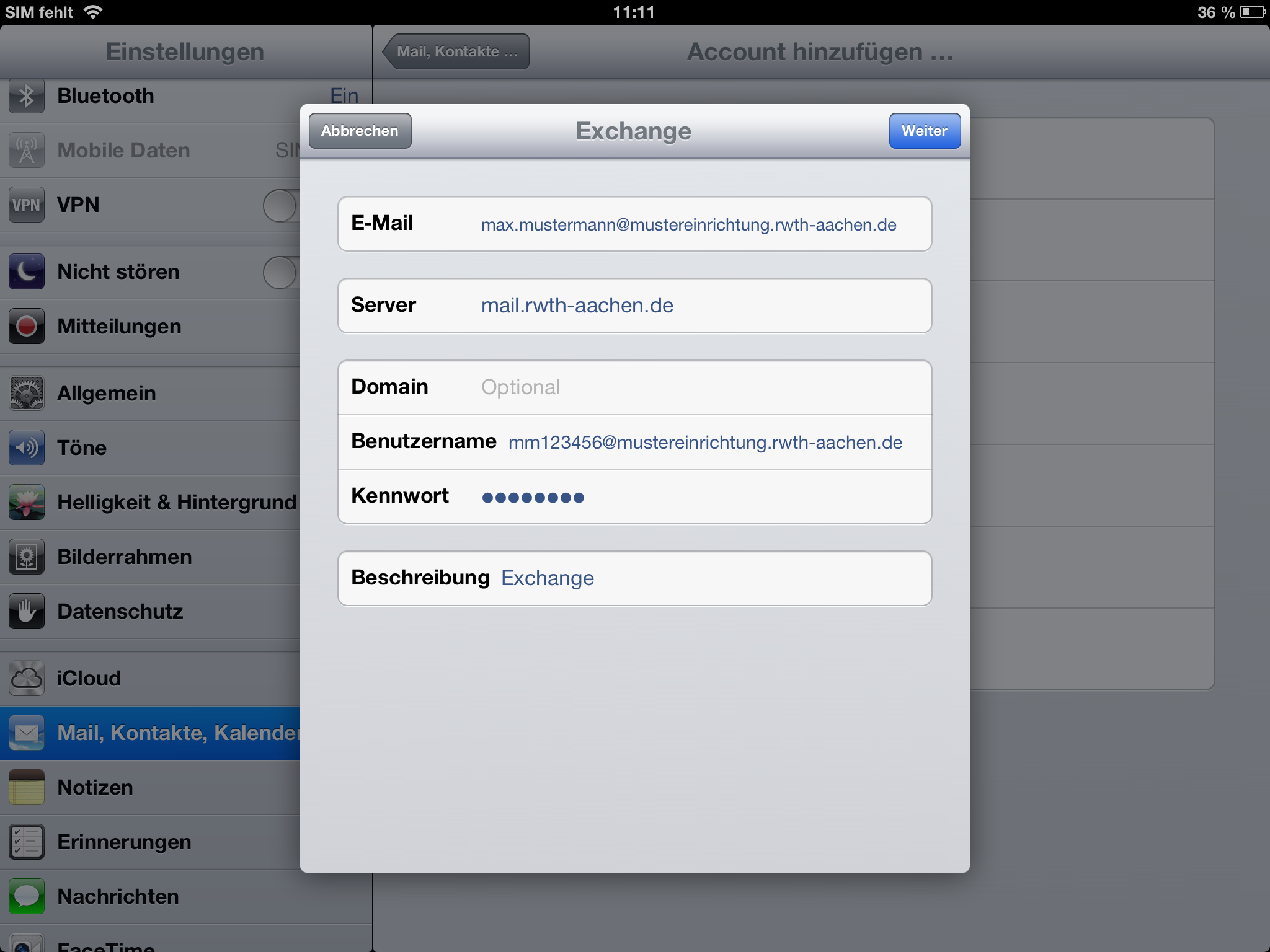 For institute e-mail addresses please use your own domain (e.g.: Mustermann@xyz.rwth-aachen.de)