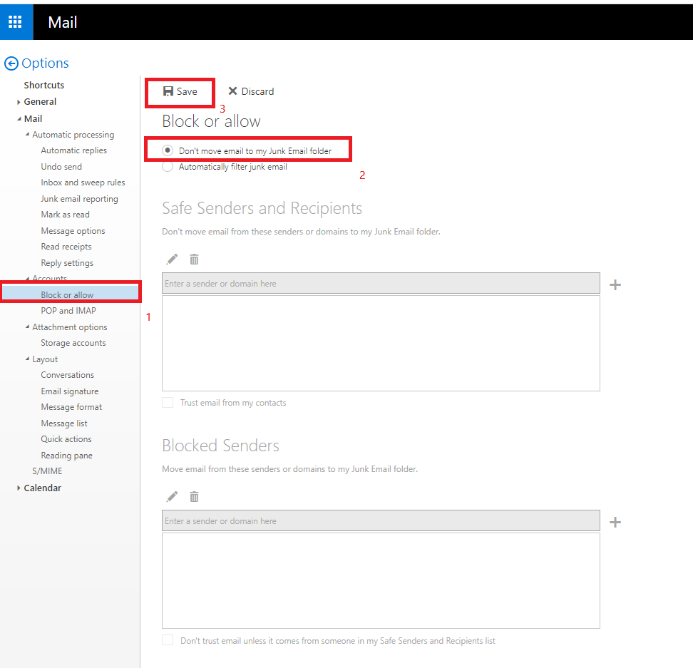 Under Block or allow, you can also completely disable spam detection and moving E-Mails to the junk e-mail folder if required (2).
