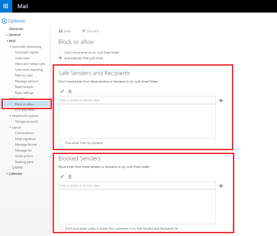 Under the Accounts > Block or allow option, you can differentiate between Safe and Blocked senders (addresses).