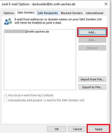 Depending on the configuration, email addresses entered there are either moved directly to the spam folder (Blocked senders) or not moved by spam filtering (Safe Senders and Recipients).