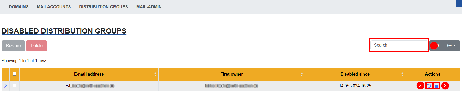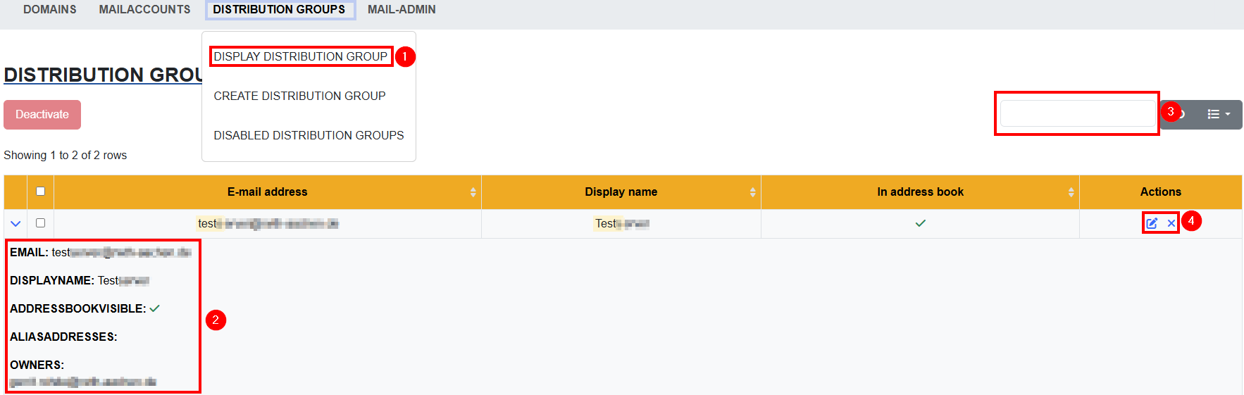 - Via the search field (3) one can look for distribution groups that were already created. They can be edited or deactivated via the column Actions (4).