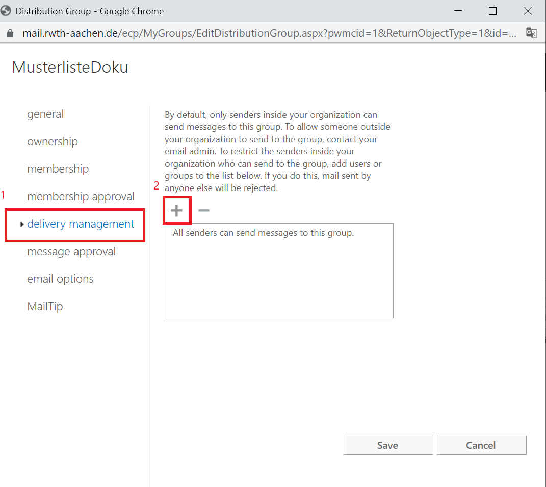Select "Delivery Management" (1) then click the "+" (2) to add a group of your choice to finish "Save" the process.