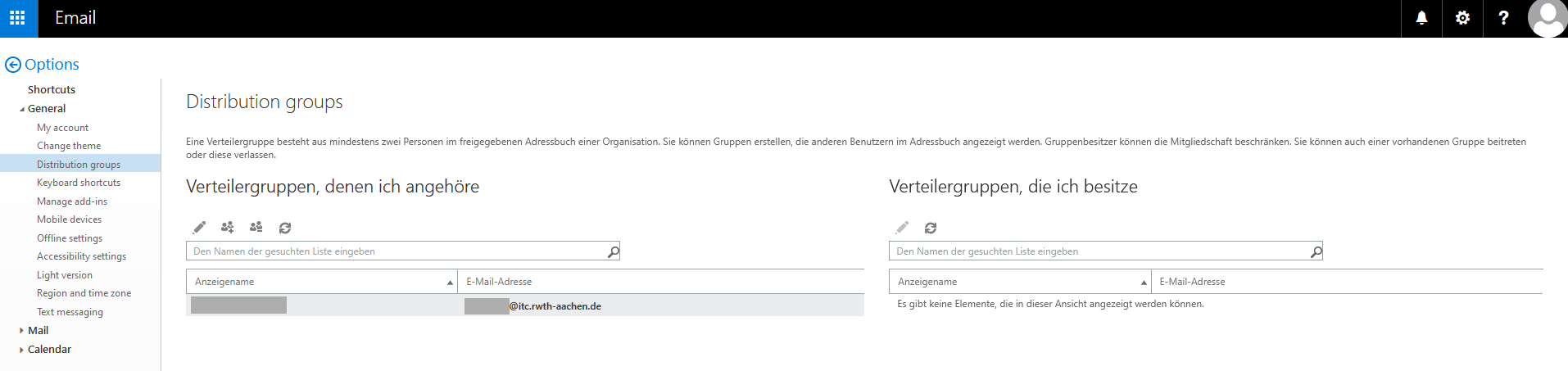 Jetzt sehen Sie Verteilergruppen, denen Sie angehören und jene, die Sie selbst besitzen.