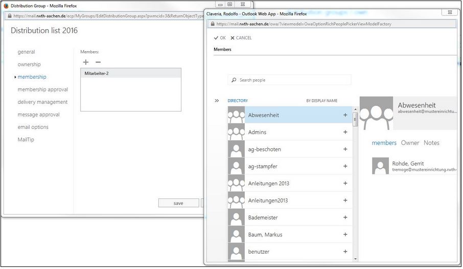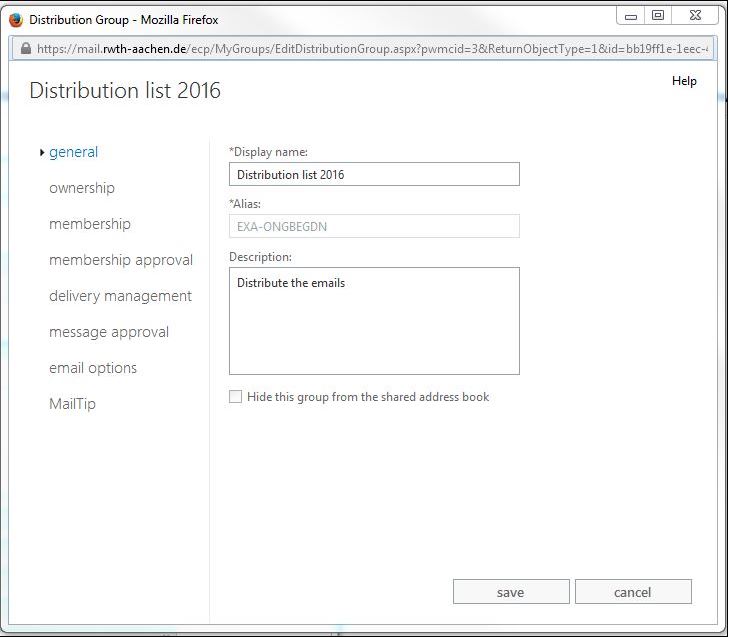 The owner of a distribution group is able to administrate the distribution group via the Outlook Web App. Only the administrator of the institute is able to nominate somebody as the owner of a distribution group.