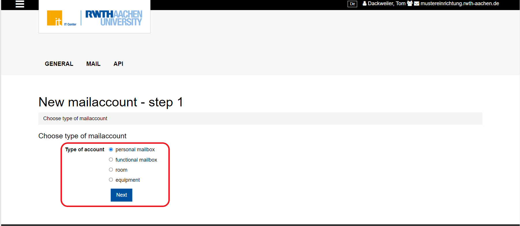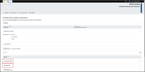 The menu item Mail accounts displays all active mail accounts that belong to the chosen domain (e.g. @sample-institution.rwth-aachen.de).