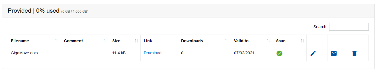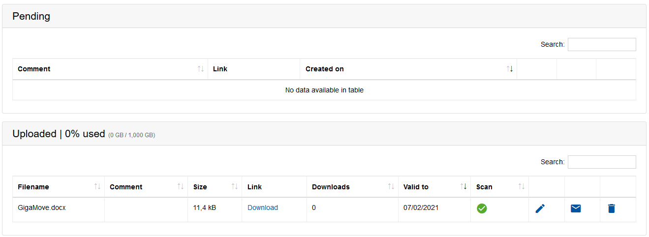 You can edit, send a mail or delete the requests or the download for the pending requests in the same way as for the uploaded files.