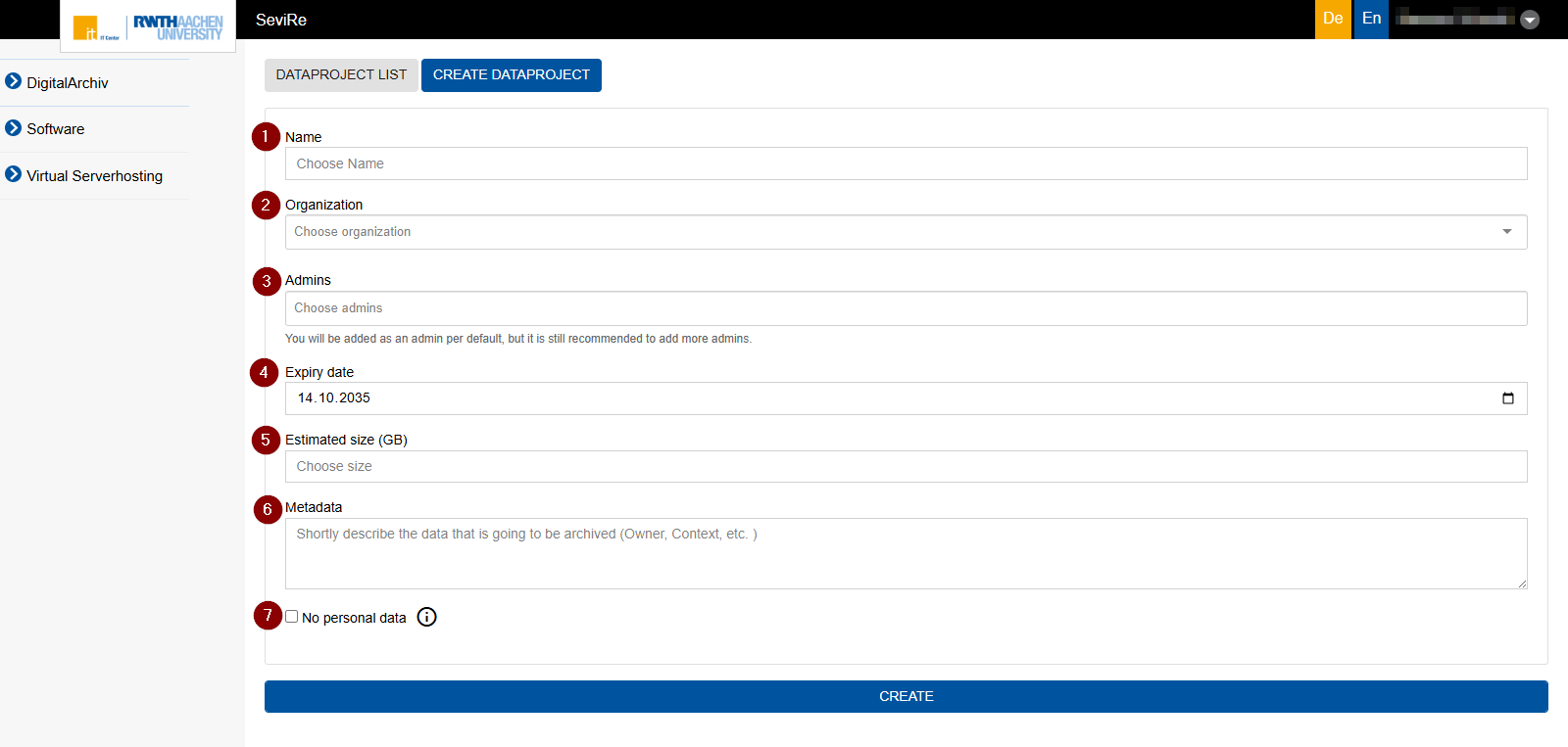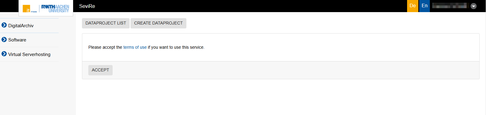 The creation and administration of a data project is done via the SeviRe platform (self-service of virtual resources).