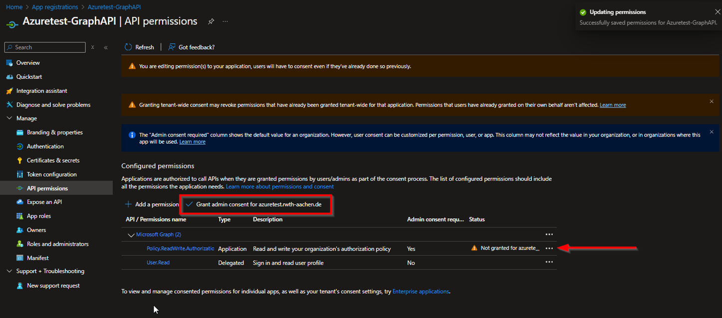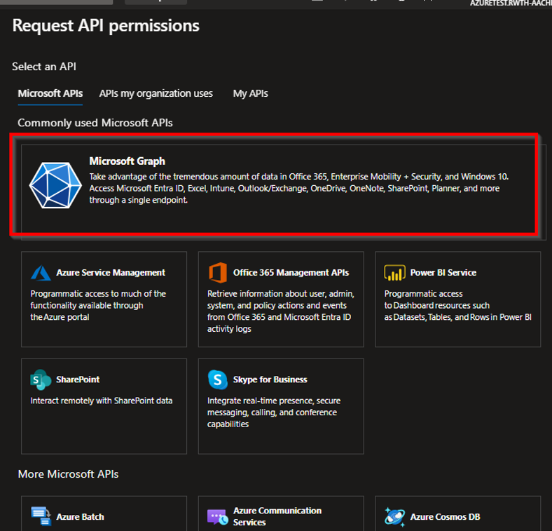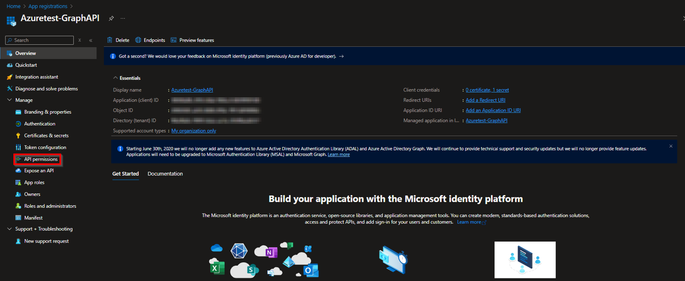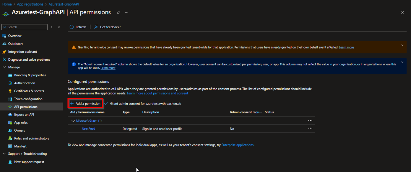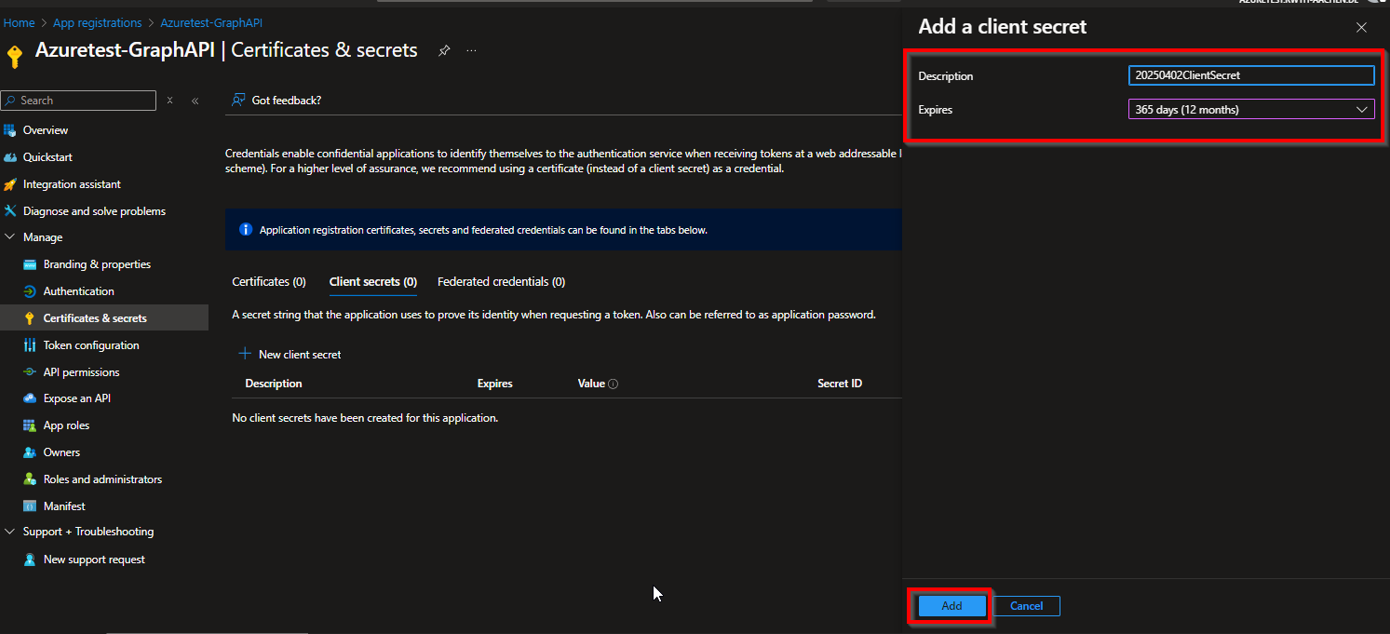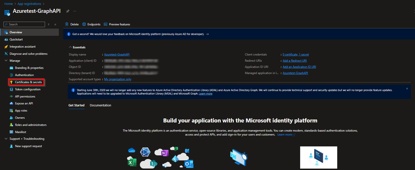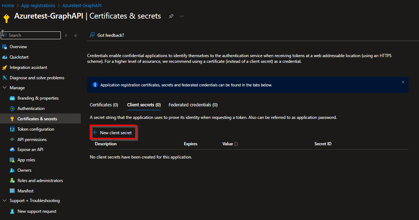 To do this, select the newly created app (in this case Azuretest-GraphAPI) and click on Certificates and secrets in the navigation bar on the left-hand side.