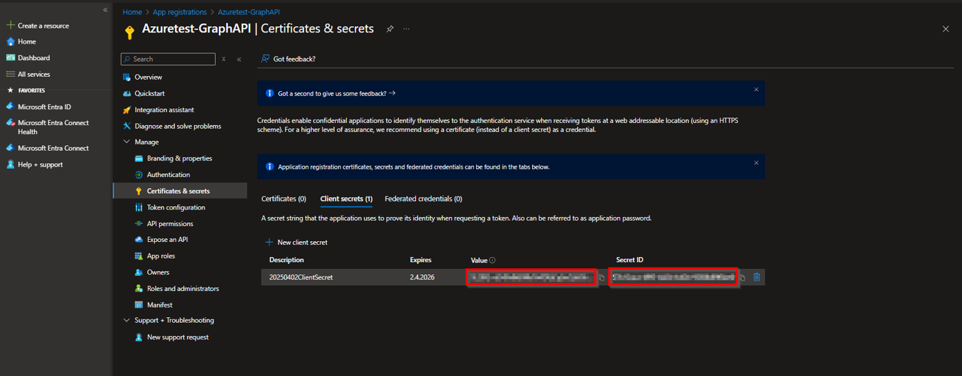 The client secret is now displayed. Please save both the value and the secret ID directly separately.