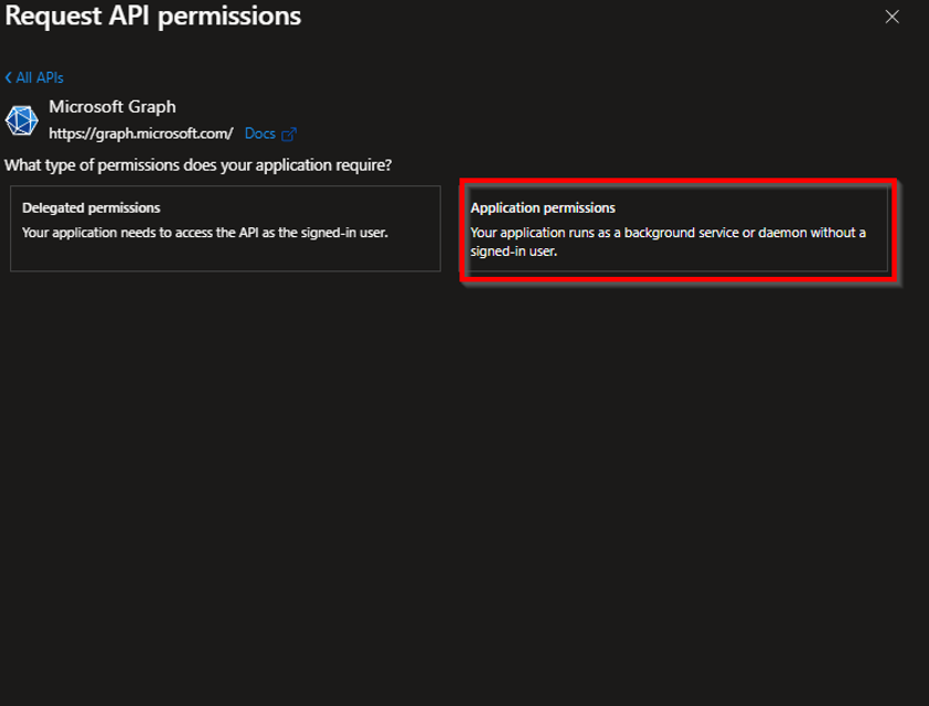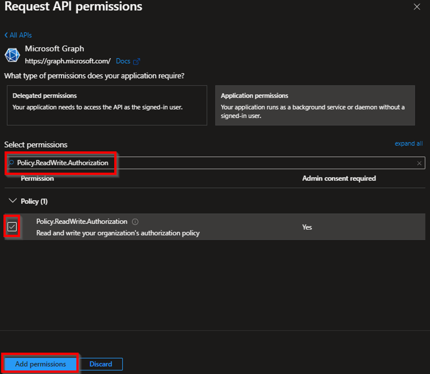 You now have the option of specifying the type of authorization and can select Policy.ReadWrite.Authorization here.