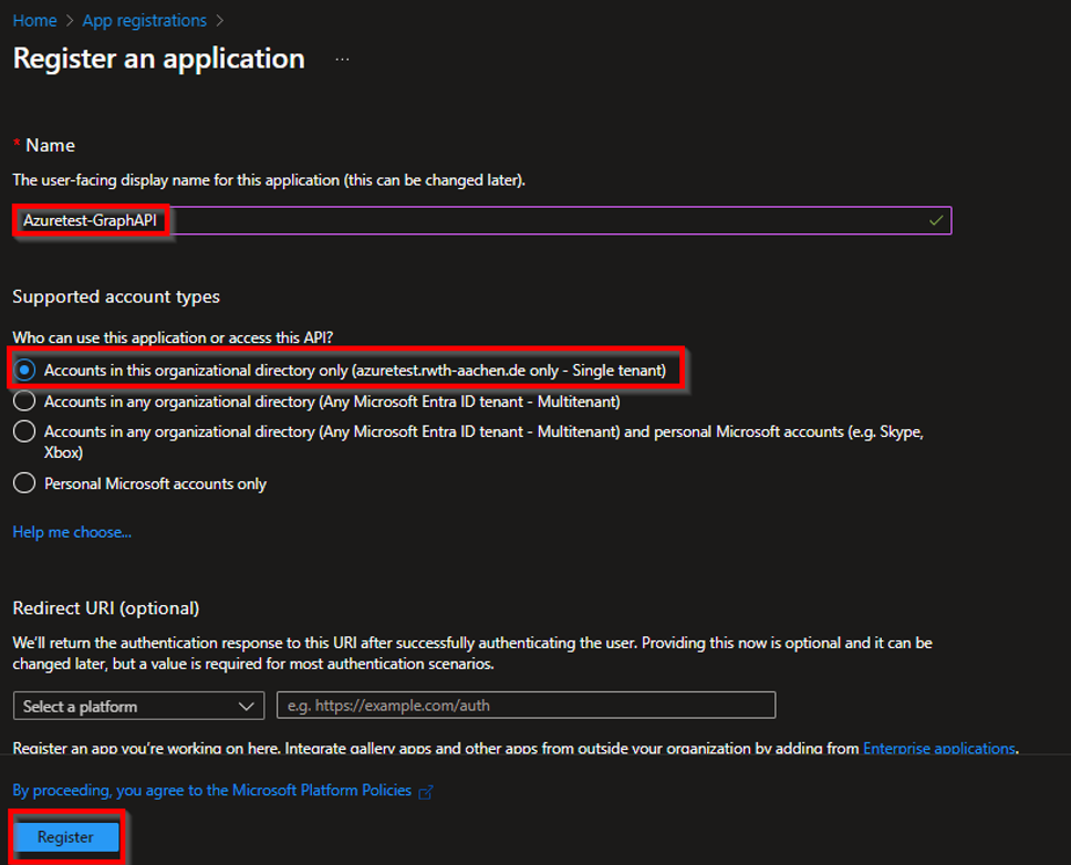 - Who can use this application or access the API: Only accounts from the directory of this organization (Selected organization - single tenant)