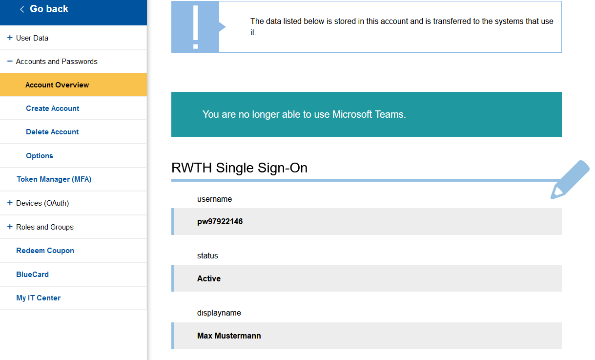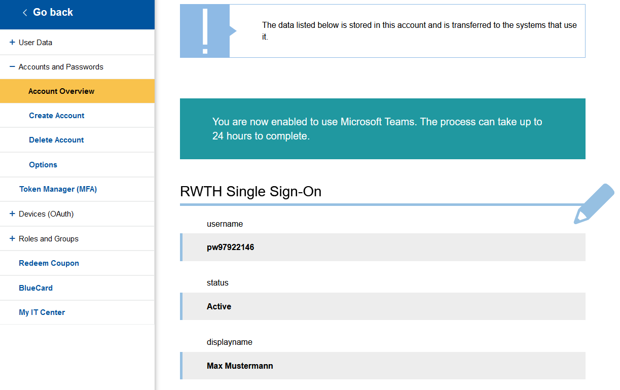 - select the pen for editing to the right of the sub-item “RWTH Single Sign-On”.
