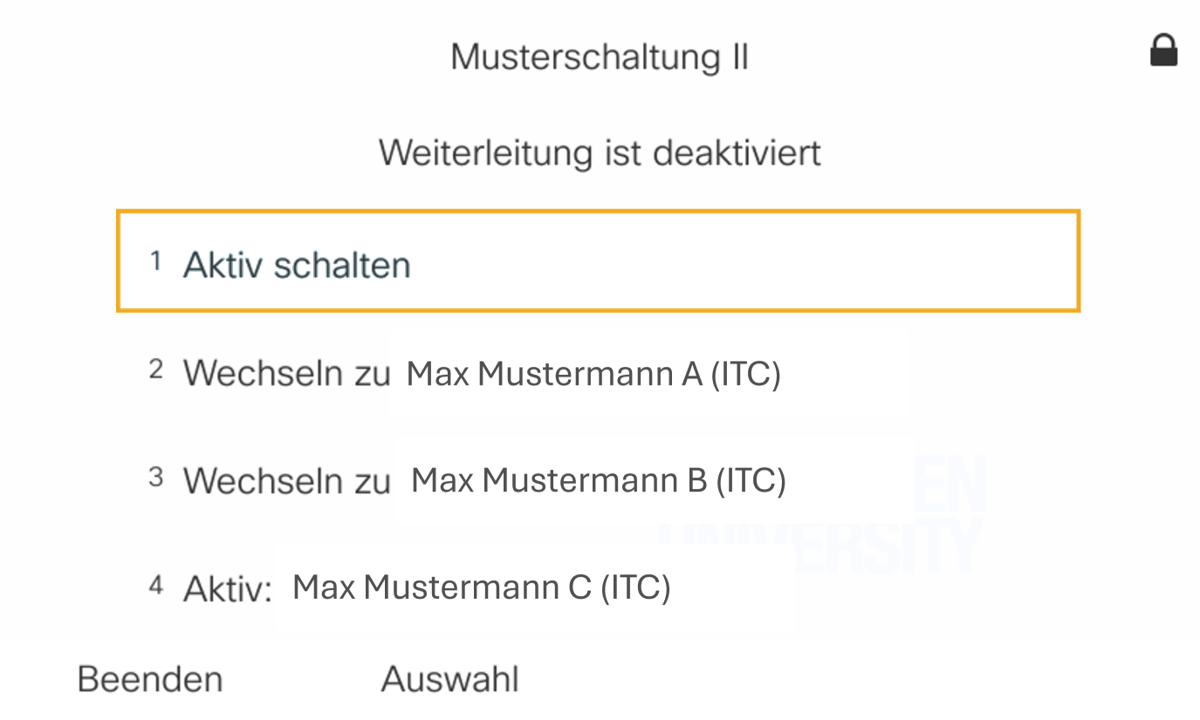 In the picture on the right, the executive Manager Assistant funtion is currently deactivated (Weiterleitung ist deaktiviert). This means that calls go straight to the Manager. To activate the Filter configuration, use the control wheel on the phone to select Aktiv schalten and then press the Select button below.