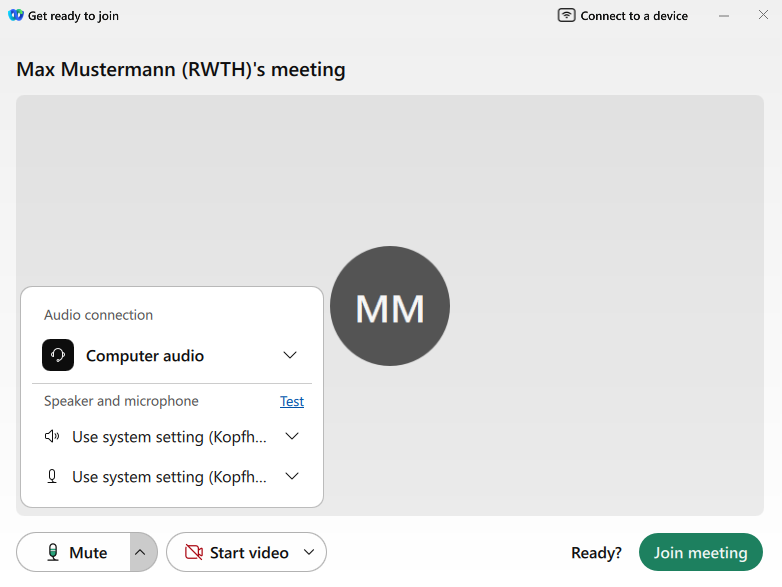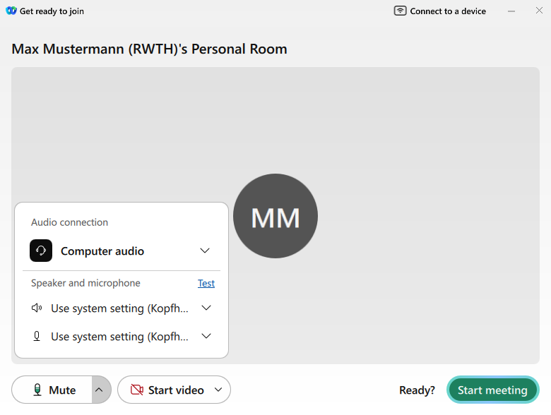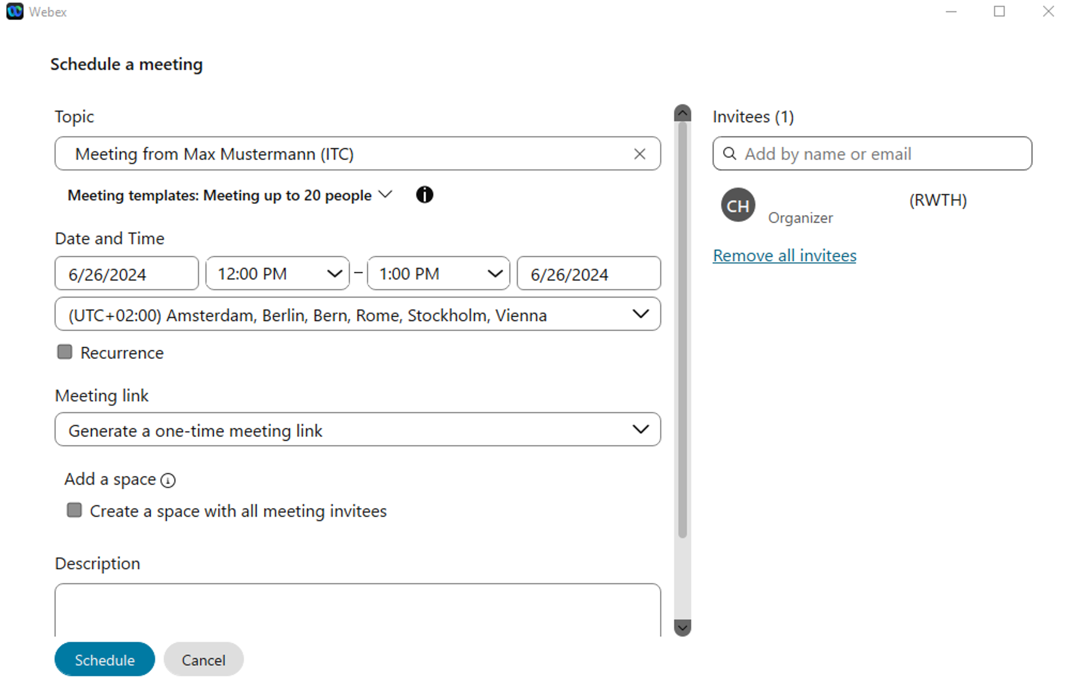 If you want to schedule meetings with the highest possible security, you can create a private meeting. This type of meeting is restricted to people who are registered at RWTH and are also connected either to the RWTH data network or via VPN.