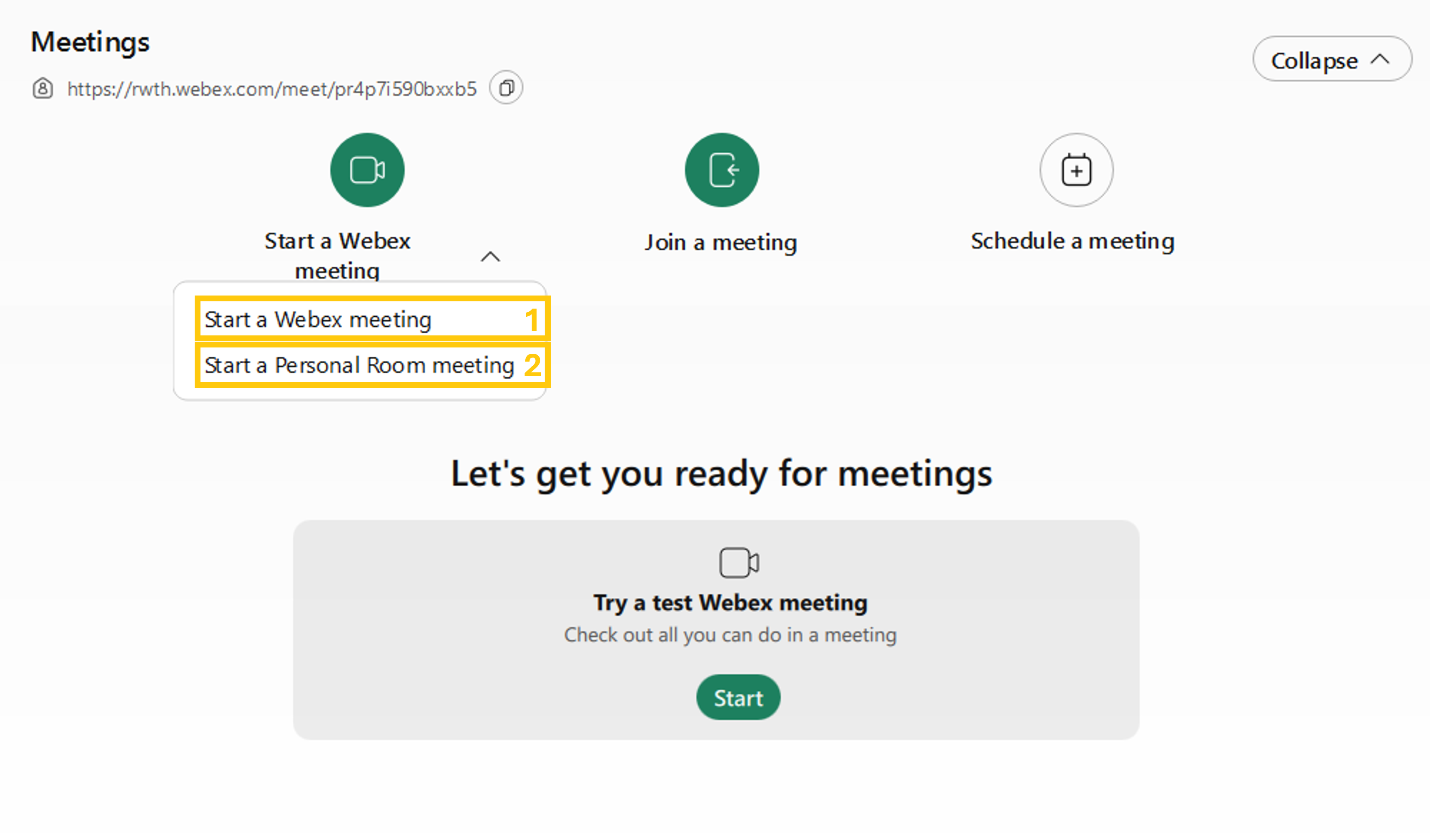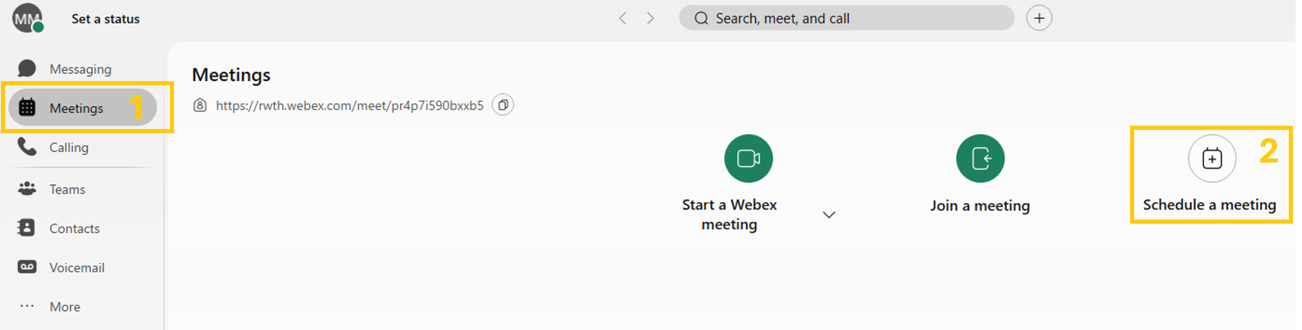 Here you will find an overview of the scheduled meetings and have the option of starting a Webex meeting (1). You can also start a Personal Room meeting (2). The subtitling function is available for barrier-free meetings.