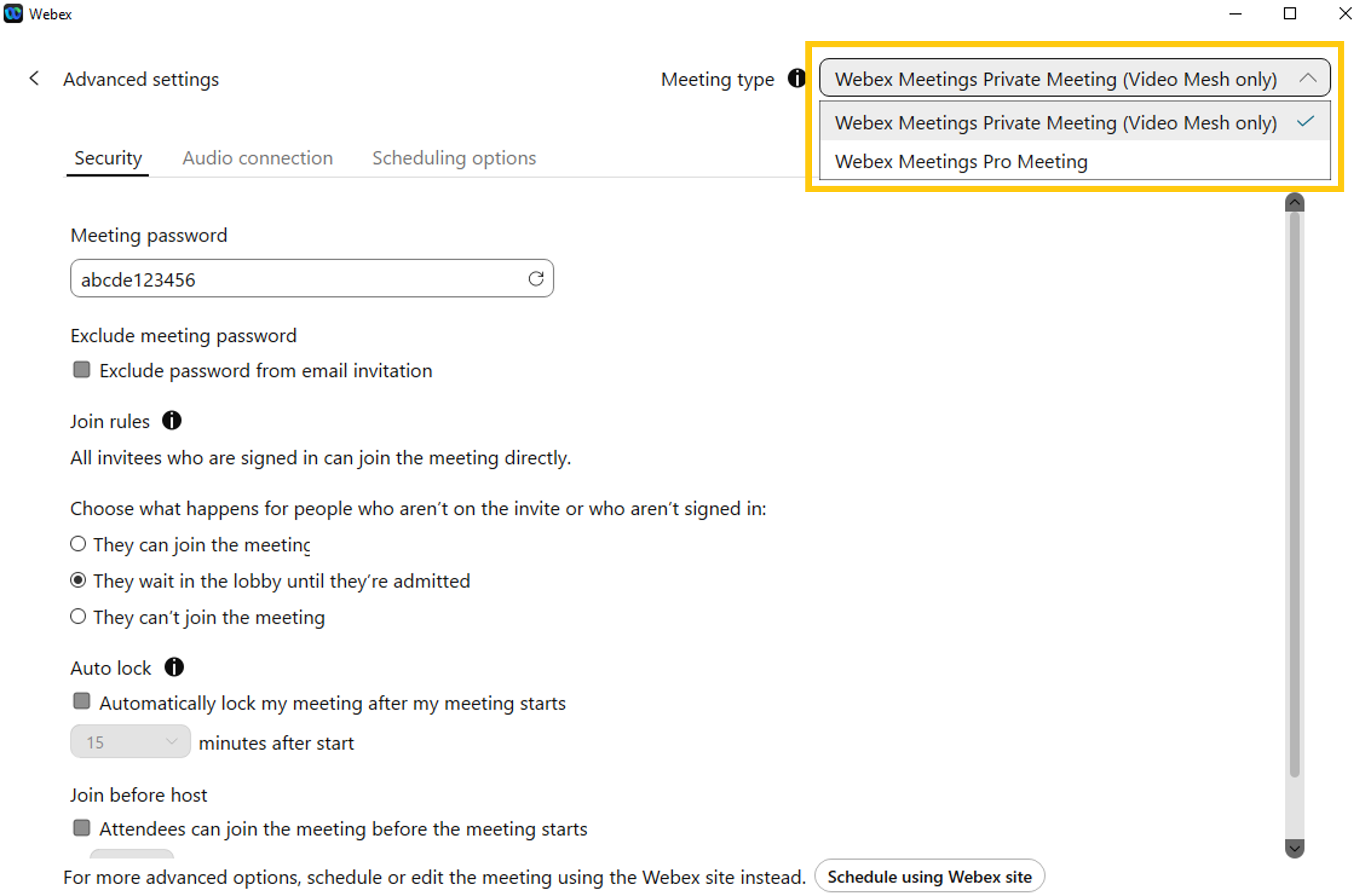 In the next window, click on Advanced options and select the meeting type Webex Meetings Private Meeting.