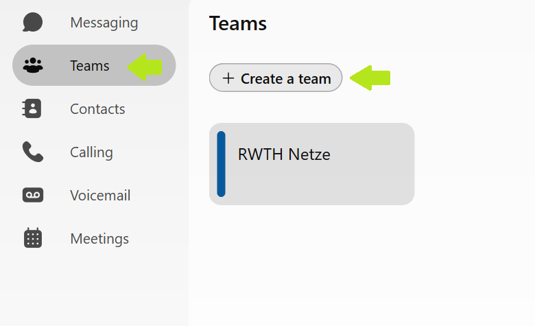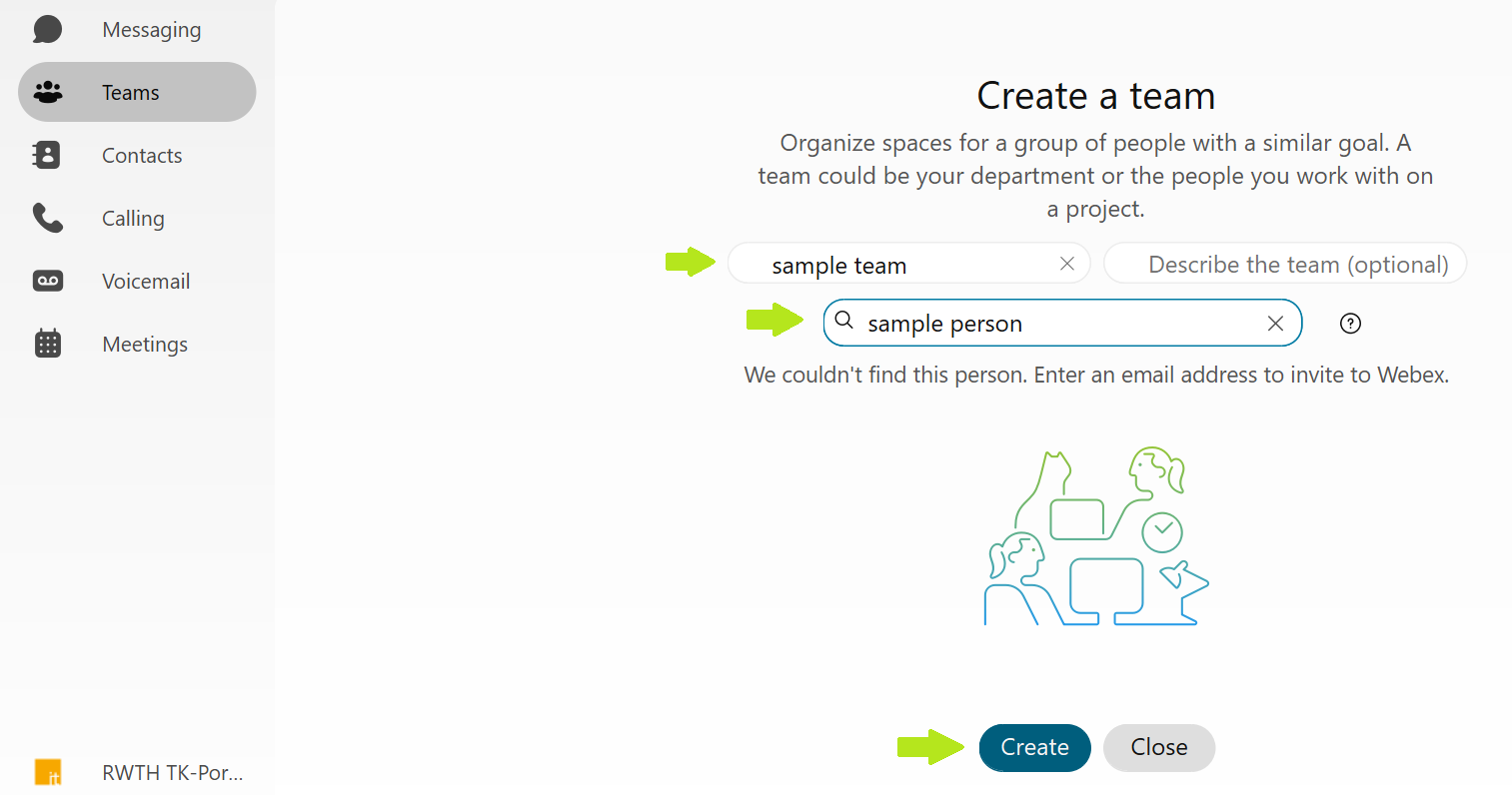 A team can be created in the Webex client under the Teams tab. To do this, click on Create team and enter a name for your team in the window that opens. Optionally, you can also describe the team here. Add people by entering their email addresses or names and then click Create to set up your team.
