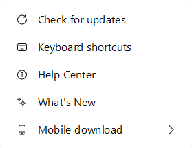 Here you will find access to the Webex Help Center and the option to check for updates, set up shortcuts and view new features in Webex by clicking on What's New.