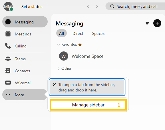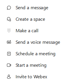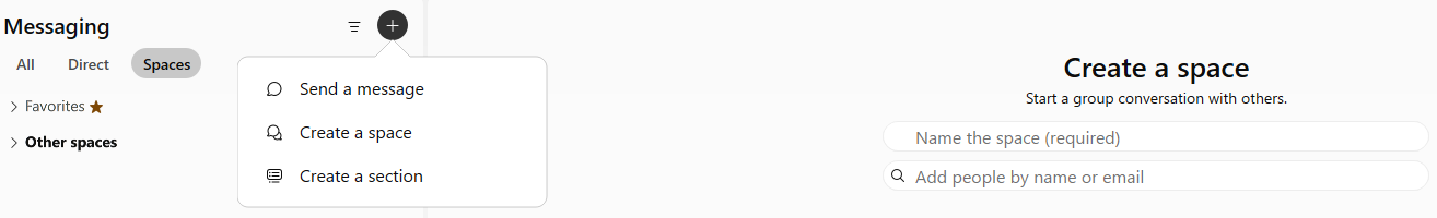 Using the plus button next to the search bar, you can easily send messages, make calls, schedule meetings or create an space.