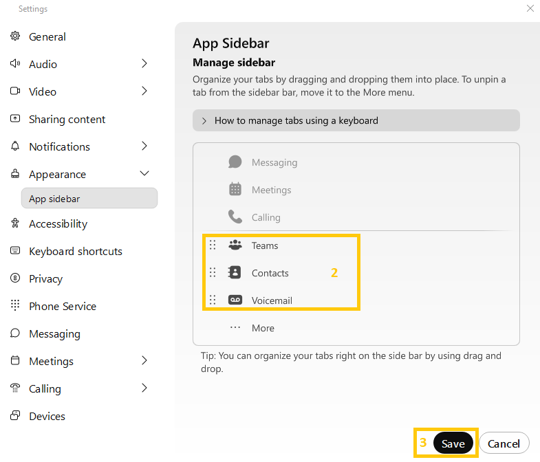 Here you can change the order of the menu items Teams, Contacts and Voicemail. To do this, click on Manage sidebar (1). Move the mouse to the 6 dots next to the respective menu item (2), hold down the left mouse button and move the menu items to a different position. You cannot move the grayed-out menu items. Then click on Save (3).