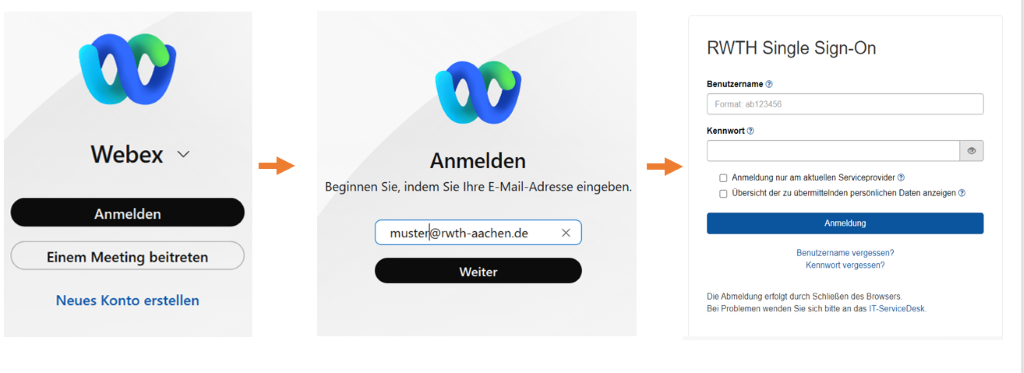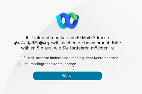 If you already have a Webex account with the specified e-mail address, this must be transferred to the RWTH Webex. If you see the following message, please select "Ihr ursprüngliches Konto löschen" (Delete your original account). All data stored in the original account will be lost.