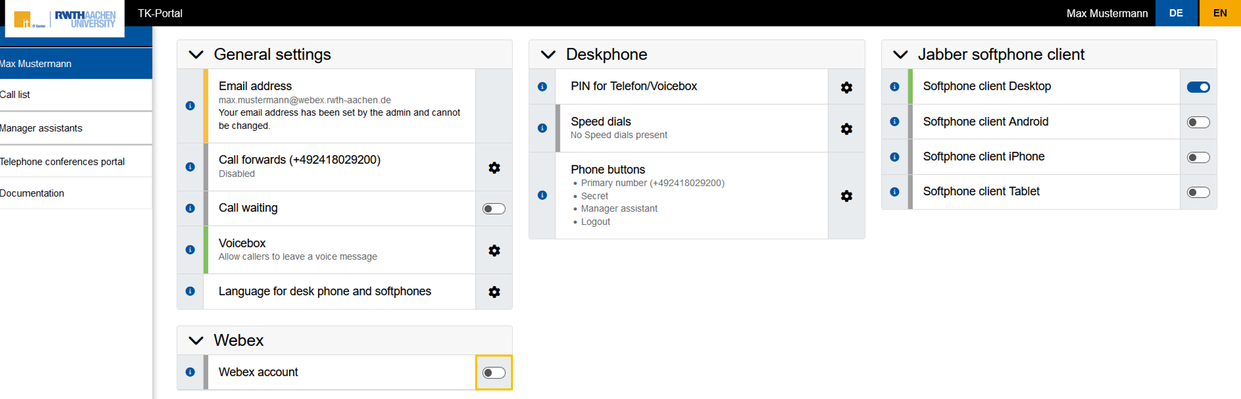 As an employee of RWTH Aachen University, you can create your Webex account via the TK portal. You can then use Webex via the app and via the website (cloud). Follow the instructions below to create your account. You can see whether you have the status "Employee" in the Selfservice under RWTH data.