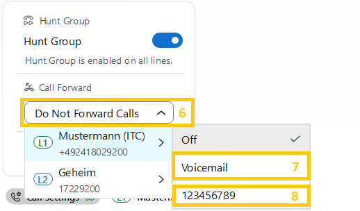 To activate call forwarding, open the call settings (1) of the user interface again. Use the button under Call forwarding (6) to select the line for which you want to enter call forwarding. In the window that opens, click on Voice mailbox (7) to forward incoming calls directly to your mailbox. To do this, you must first activate your voice mailbox (Voicebox) in the TK-Portal. You can find the instructions in the Webex user interface instructions under Voice mailbox. However, if you want the calls to be forwarded to a preferred telephone number, select one of the telephone numbers displayed (8).