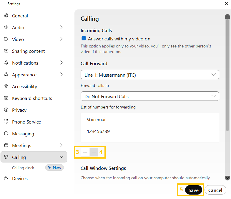 In the settings menu that opens, you can now add telephone numbers for your call forwarding by clicking on the plus button (3), typing in the number and pressing Enter.
