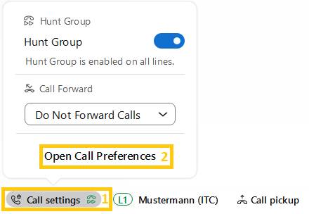 To set up call forwarding in Webex, click on Call settings (1) in the user interface. By default this is found at the bottom left in the application window. Then proceed to Open call preferences (2).