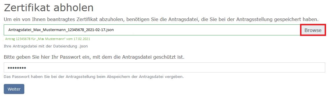![]() | Browse: From your file explorer, select the "certificate application data file" (.json) that you saved when you applied for the certificate. Then enter the password for the .json file and click Next (please DO NOT klick "Enter" to confirm the password). |