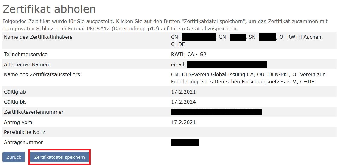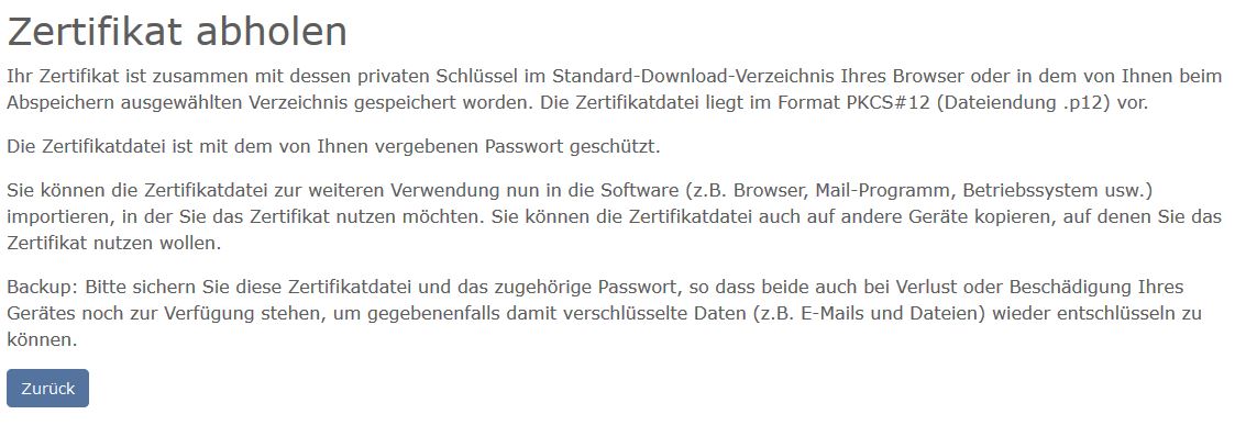 The .p12 file contains your own RSA key pair and the associated DFN-PKI user certificate. If you change computers, reinstall the operating system or use other applications and you want to keep using your still valid certificate, you will need to bring the .p12 along and "install" it again. For this reason, it is essential to save this file as a backup copy in an adequately safe location. Even after the user certificate has expired, the .p12 file should be retained, so that you can still read old encrypted e-mails.