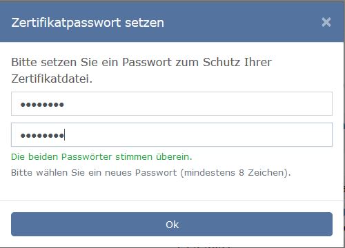 ![]() | The .p12 file is stored encrypted. Here you have to assign the password for this encryption and remember it long term. You will need this password to subsequently import the .p12 file into other applications (e.g. e-mail, PDF reader). Choose a safe place to store the .p12 file long term. |