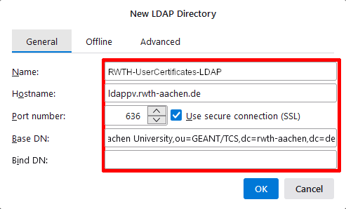 - Name, hostname and Basis-DN depending on the LDAP server. Please find the required information in LDAP for user certificates from the RA-Portal