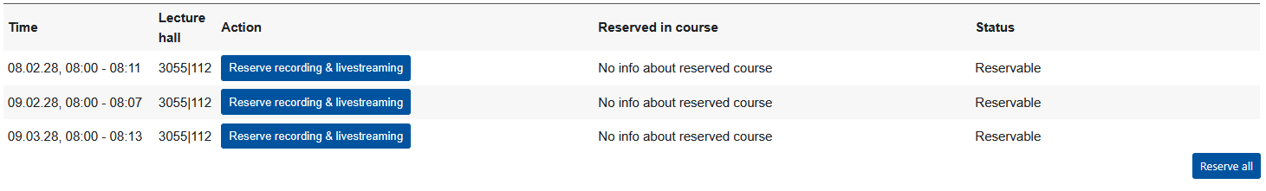 - Reserving a series of recordings - If you would like to reserve the complete series of recordings of a course with one mouse click instead of scheduling them one by one, click on the "Reserve all" button on the right below the last listed time slot.