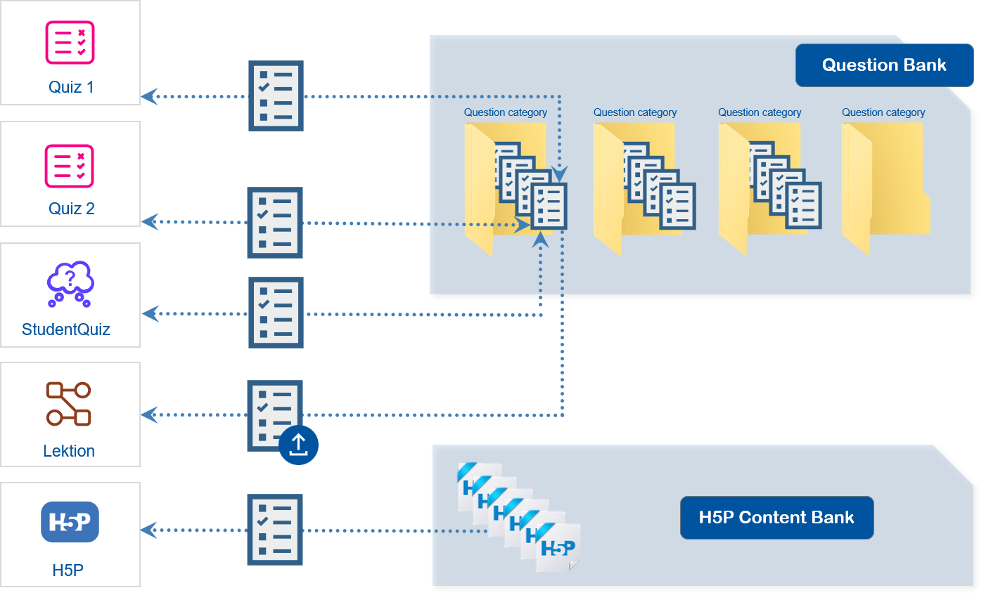 All questions used within a course room room in the “Quiz” and in the “StudentQuiz” are stored in the Question Bank. The same questions can be integrated multiple times in different Quizzes and also in StudentQuizzes via the question collection. The H5P content types created within a course room, on the other hand, are stored in the H5P Content Bank.