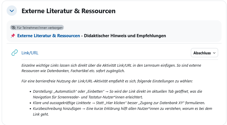 The templates provide a compact overview and helpful information on progress elements such as activity completions, access restrictions, and checklists. These help students keep track of their learning progress while promoting self-organization and motivation.