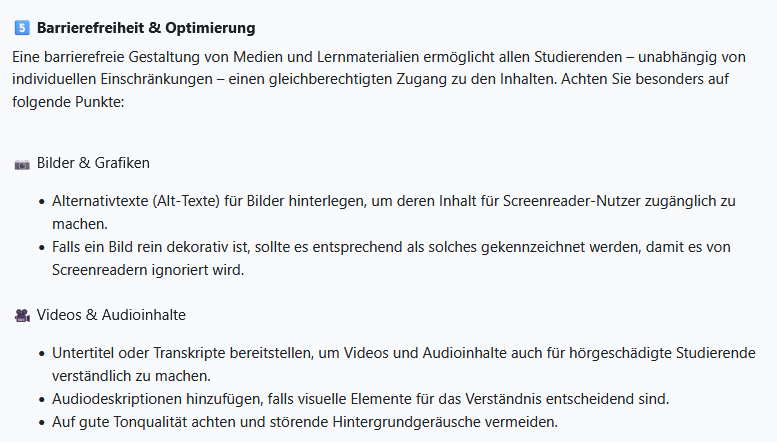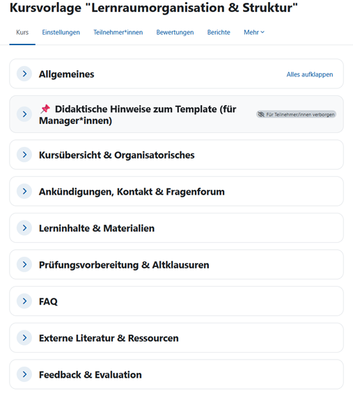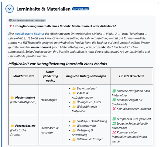 - Lernraumorganisation und Struktur (Course room organization and structure) - for a clear, uniform and well-structured course design
