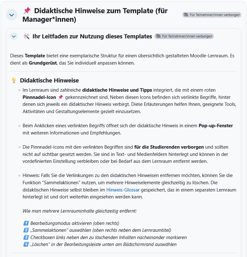 In the section „Didaktische Hinweise zum Template (für Manager*innen)" (Didactic notes on the template (for managers)) you will find all the information you need to use the respective templates, for example to remove course room content, customization options and a step-by-step guide to creating an individual course room and for the meaningful integration of progress elements.