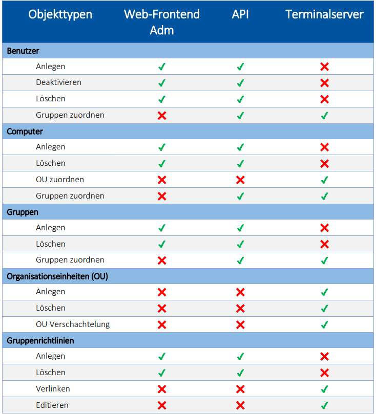 The following table shows a comparison of the functional scope of ADAM accesses: