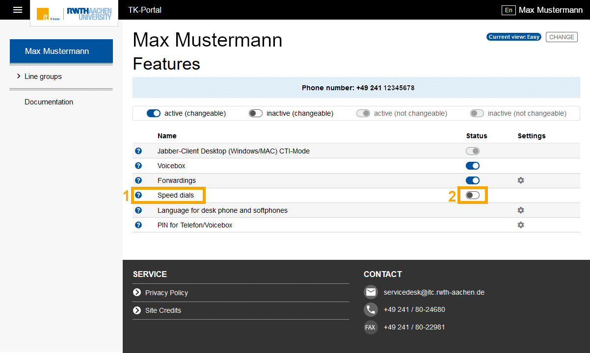 On your overview in the TK-Portal, please activate the Speed dial (1) via the slider (2).