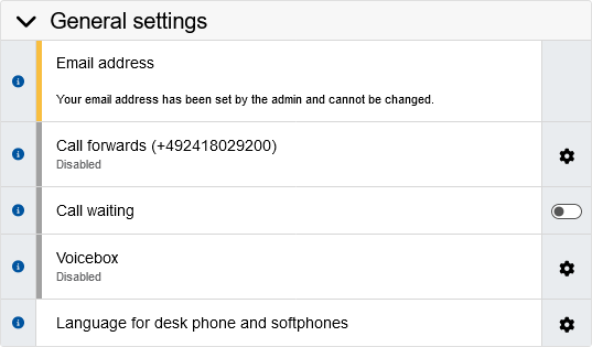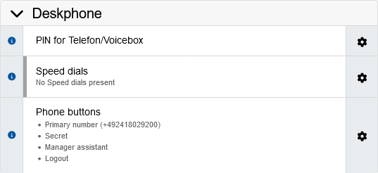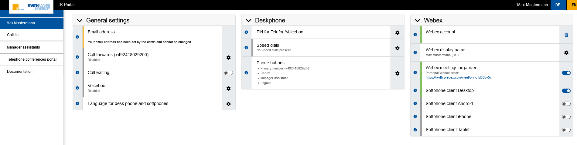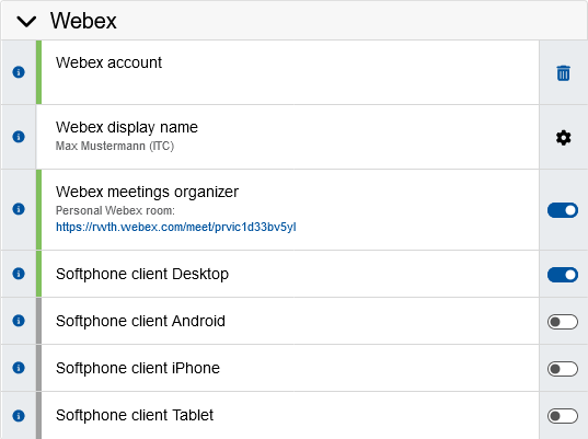 The "General settings", "Deskphone" and "Webex" menus can be hidden or displayed by clicking on the respective title bar.